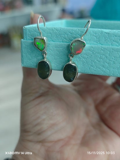 EXPECTACULAR PENDIENTE DE PIEDRA NATURAL DE TECTITA MOLDAVITA, DE LA REPÚBLICA CHECA, Y OPALO
