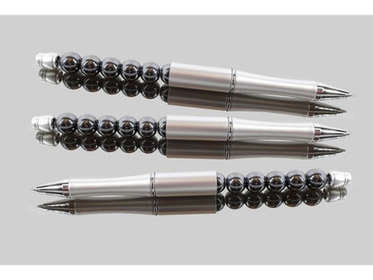 Este bolígrafo diseñado con bolas de hematite tiene un comodo y práctico sistema de cierre que se recoge mediante el giro.
