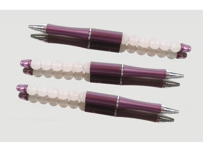 Este bolígrafo diseñado con bolas de cuarzo rosa tiene un comodo y práctico sistema de cierre que se recoge mediante el giro.