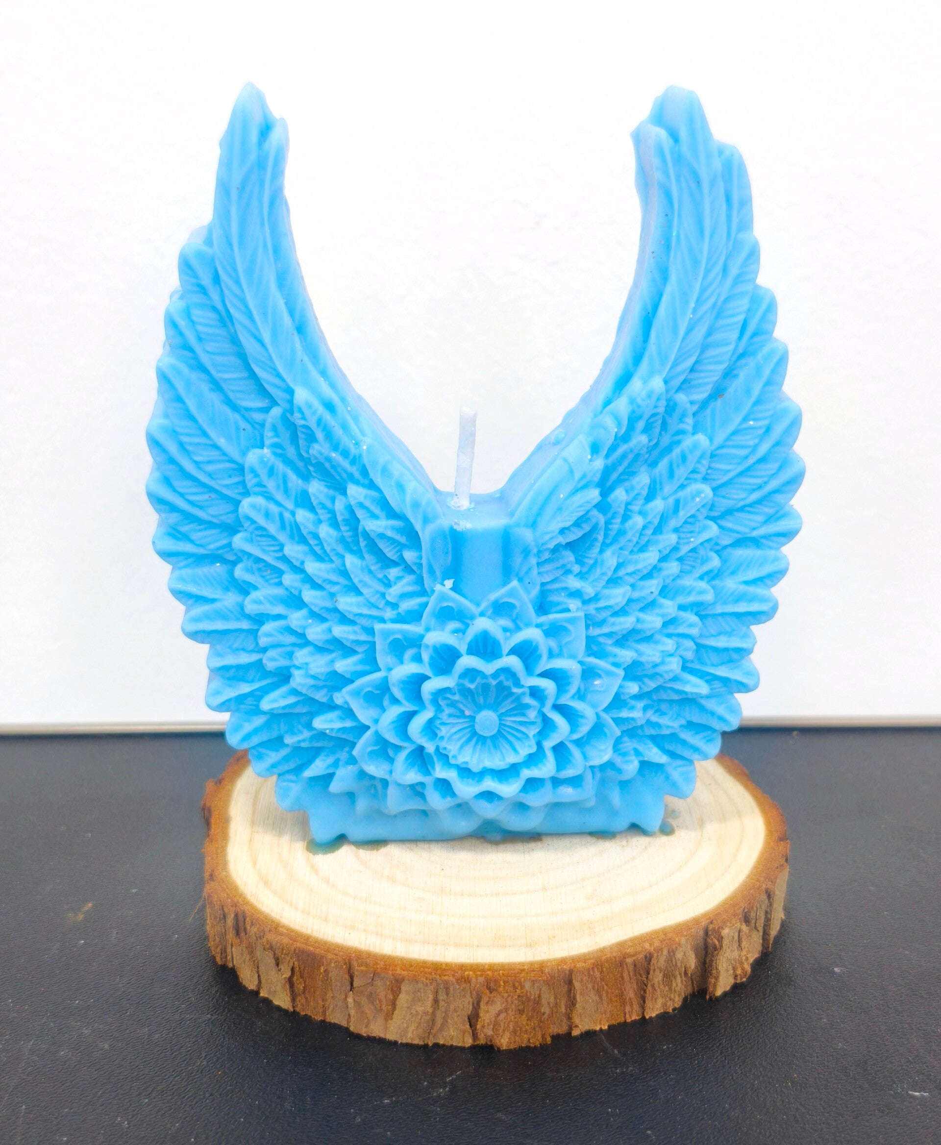 VELA ALAS DE ANGEL AROMATICA AZUL CON BASE DE MADERA 13 CM
